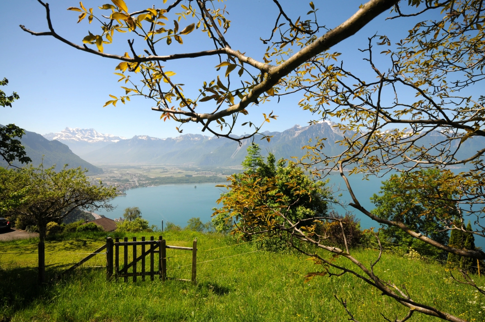 Image prise vers 11h / Sur les hauts de Caux une vue plongeante sur le léman ,arrière plan les Dents du Midi .