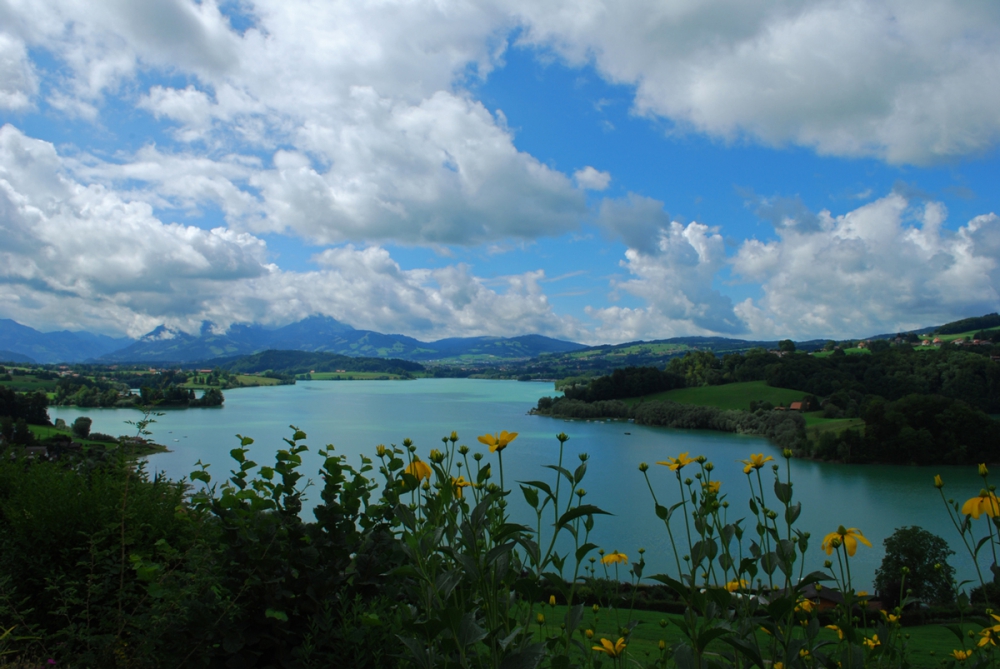 Retour des éclaircies sur le lac de La Gruyère. Les faibles pluies du matin ont lavé la nature. Vent de W modéré, 21°