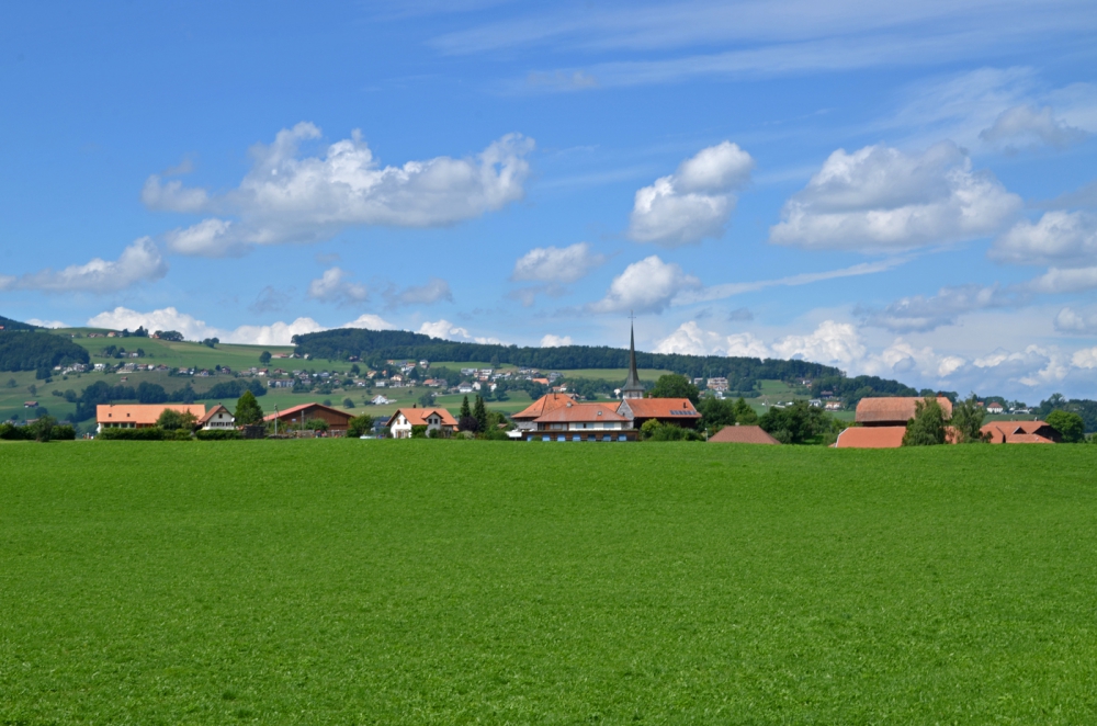 Ciel variable en début d'après-midi sur le village de Hauteville en Gruyère. La température est agréable, 20°. Léger vent de secteur E.