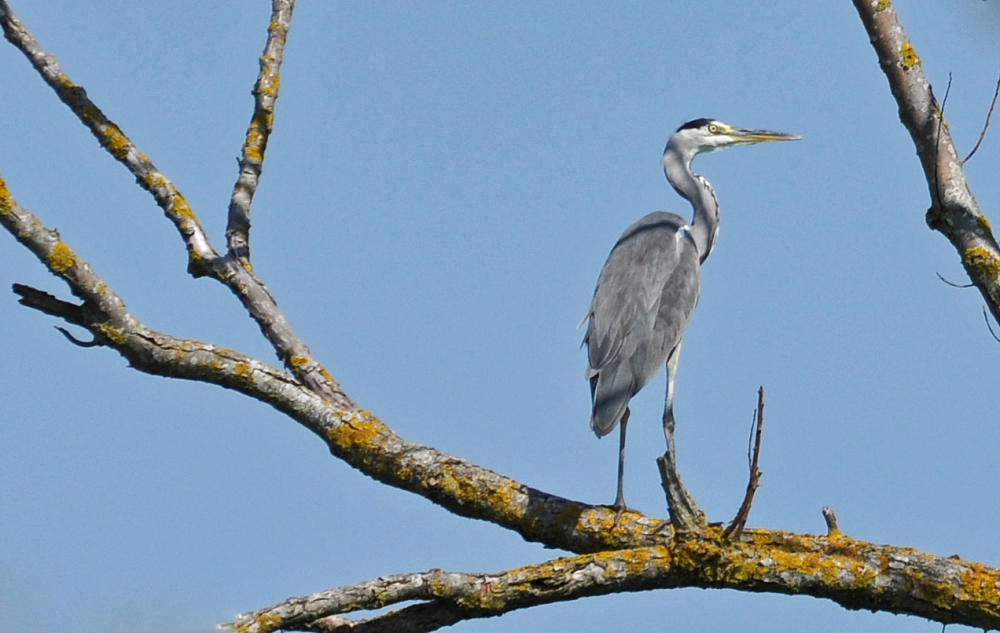 Héron cendré au soleil sur les rives du lac de Morat côté Grands Marais. Temps ensoleillé, 29° en début d'après-midi, léger SW
