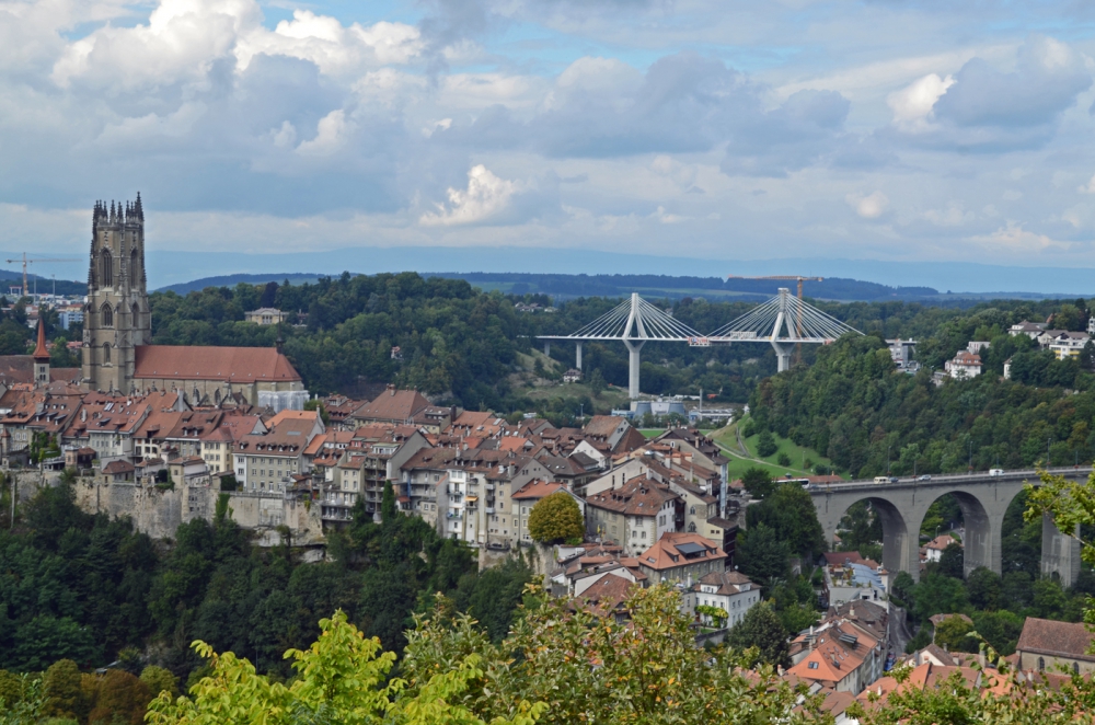 Eclaircie sur la vieille ville de Fribourg et sa cathédrale. Après un début de journée pluvieux, la météo s'améliore. Léger vent d'W, 13°