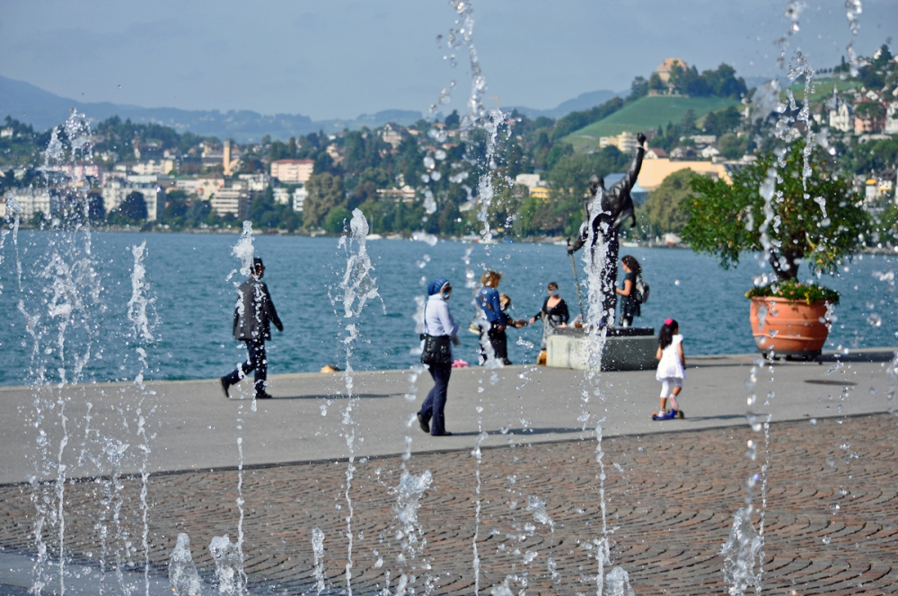 La vie en début d'après-midi vue au travers de la fontaine à jets d'eau. Temps agréable sur les bords du Léman à Montreux