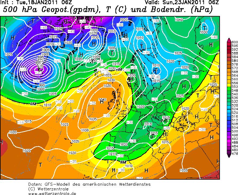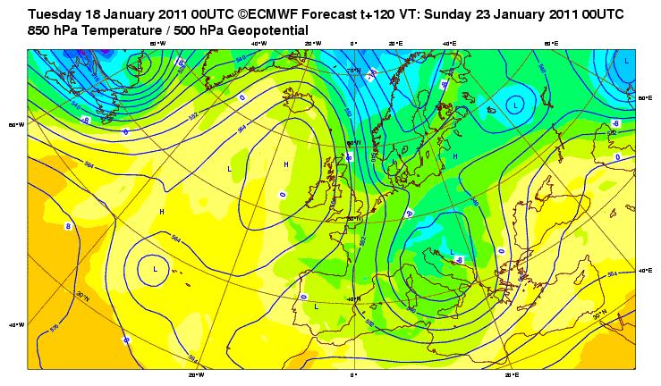 Pour dimanche prochain, les modèles GFS et ECMWF diffèrent quelque peu maintenant. GFS prévoit plutôt le maintient du courant de nord-est froid et plutôt sec, tandis qu’ECMWF prévoit un flux orienté plus au nord et davantage chargé en humidité, comme le montre l’image ci-dessous